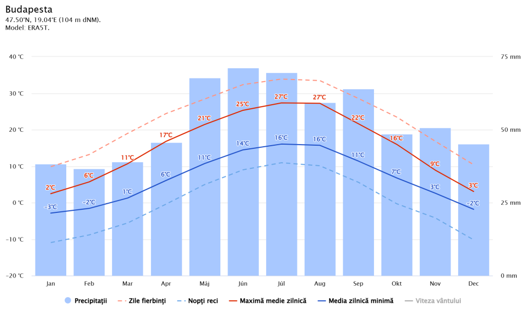 Temperatura și precipitațiile la Budapesta (sursa: meteoblue.com)