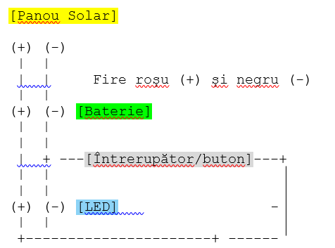 • Testare: Verifică fiecare pas (ex. LED-ul se aprinde? Bateria se încarcă?). Dacă semnele (+) și (-) ale LED-ului sunt inversate în schema sau în conexiunile reale, lampa nu va funcționa până nu corectezi