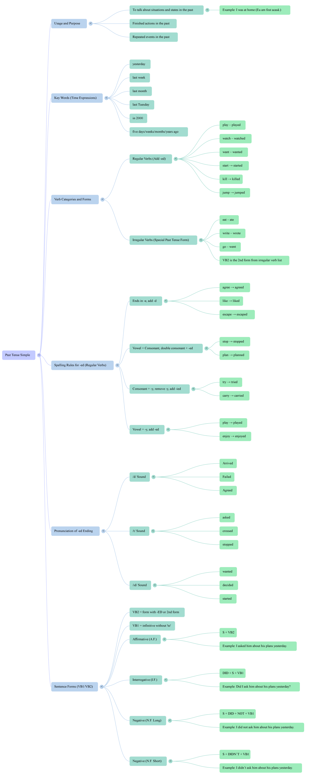 Detalii RED: Resursa este o hartă conceptuală vizuală (mind map) care prezintă structura și utilizarea timpului trecut simplu (Past Simple Tense) în limba engleză.