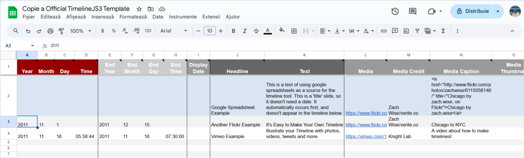 TimelineJS este un instrument gratuit, online, dezvoltat de Knight Lab, care permite realizarea unor cronologii vizuale bogate în imagini, video, hărți, linkuri și explicații. Principalul său avantaj este accesibilitatea: elevii și profesorii pot crea timeline-uri direct dintr-un fișier Google Sheets, fără cunoștințe de programare. Rezultatul final este o prezentare fluidă, plăcută, ușor de parcurs și capabilă să redea dinamica reală a evoluțiilor istorice.